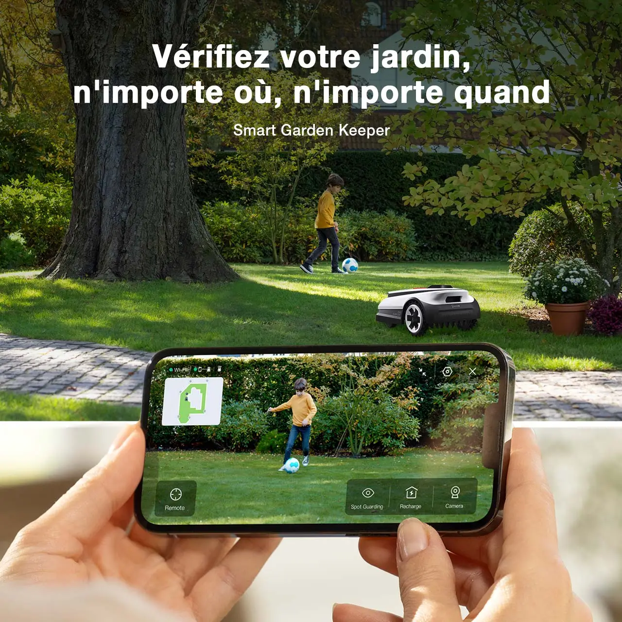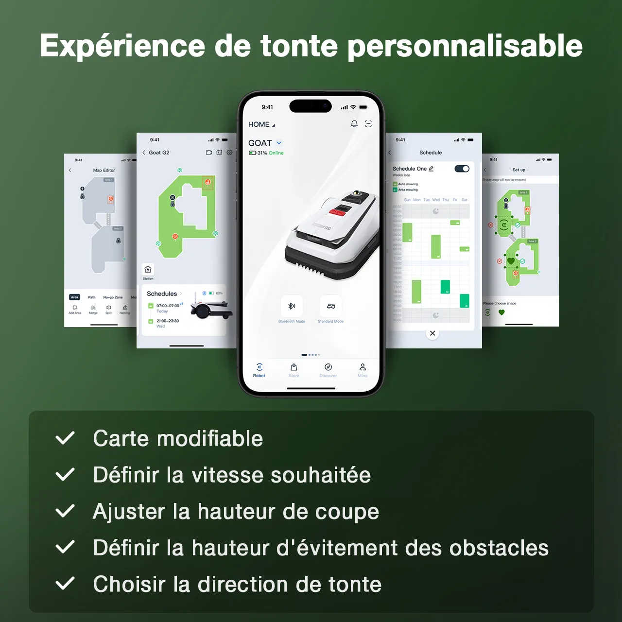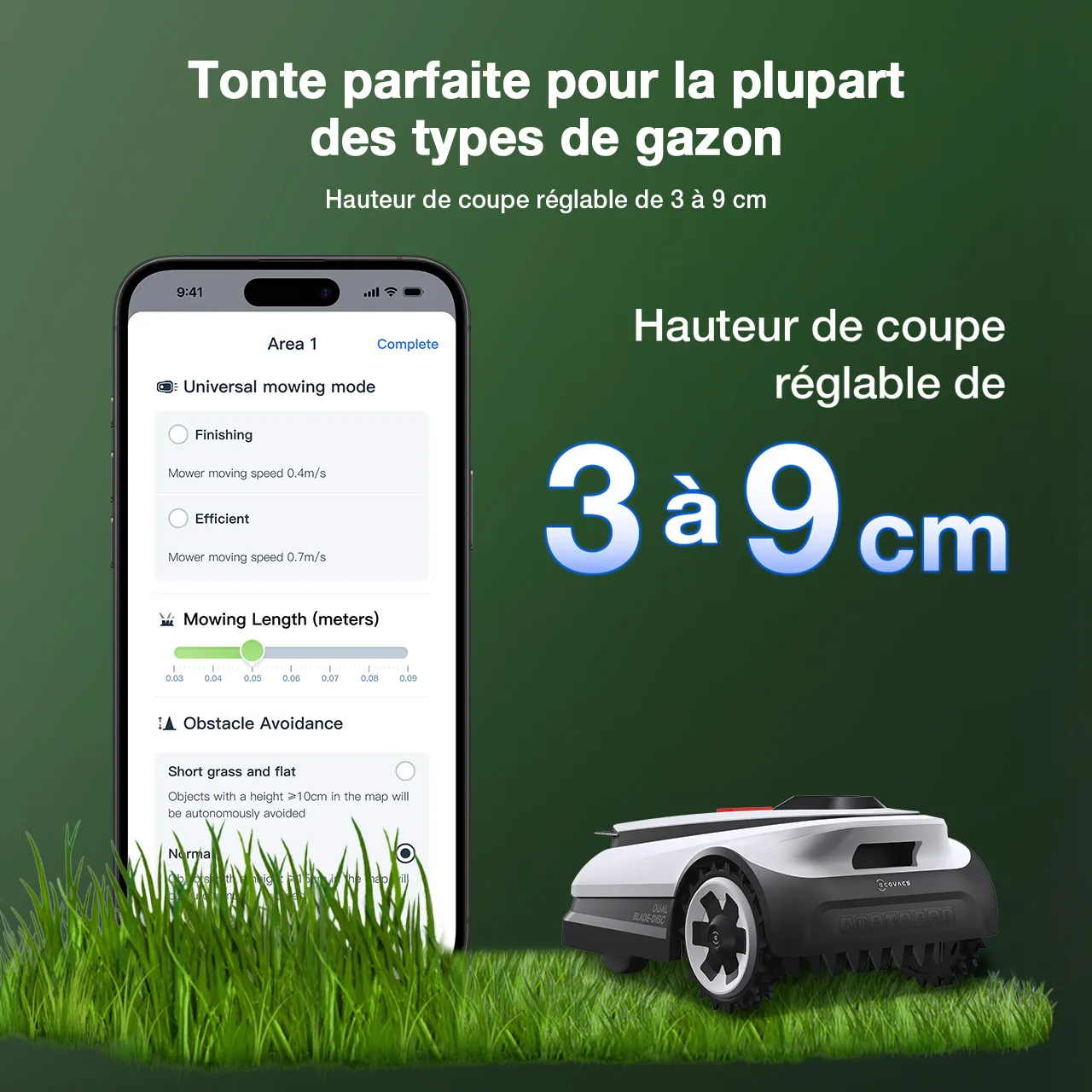 La hauteur de coupe est réglable de 3 à 9 cm par tranche de 1 cm, d’un simple glissement via votre téléphone.